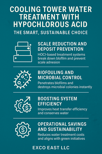 Discover the future of industrial water treatment today. Partner with Exco East LLC and experience the benefits of cooling tower water treatment with Hypochlorous Acid—reduced scale, improved efficiency, and lower costs, all while protecting your equipment and the environment.